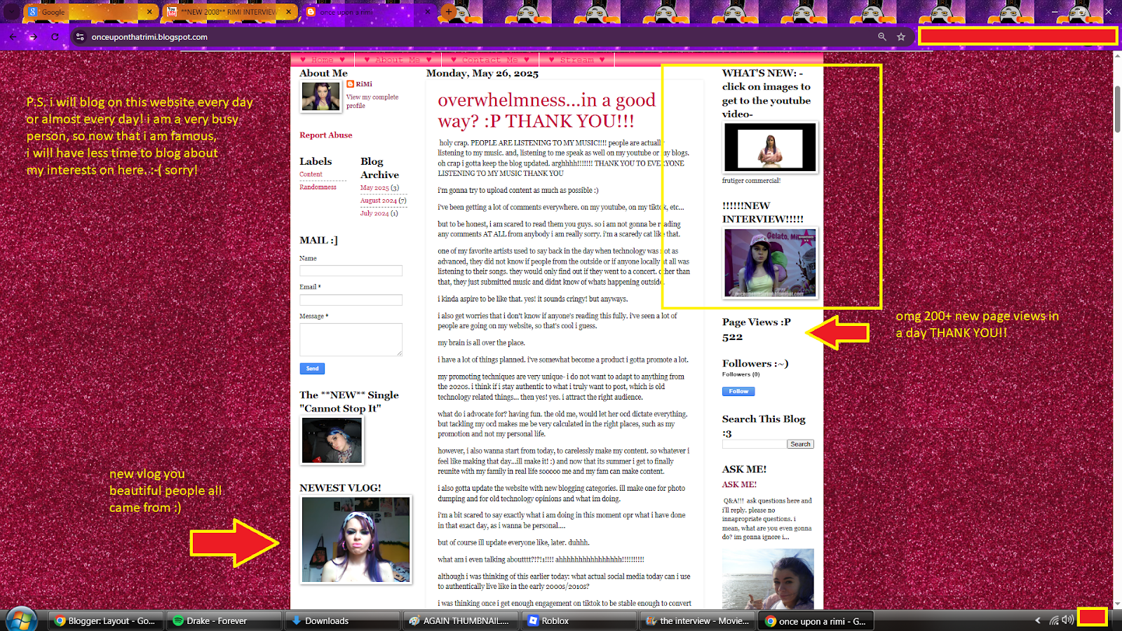 people i know personally is dying to know about this list but its such a long list! argh! sorry! but ive been living like the 2000s since i started making this album, once upon a rimi...since 2021. nothings changed and i have learned throughout the years how to avoid minimalism and shit like that. just truly living happy like the 2000s. idk if this makes sense but yeah.